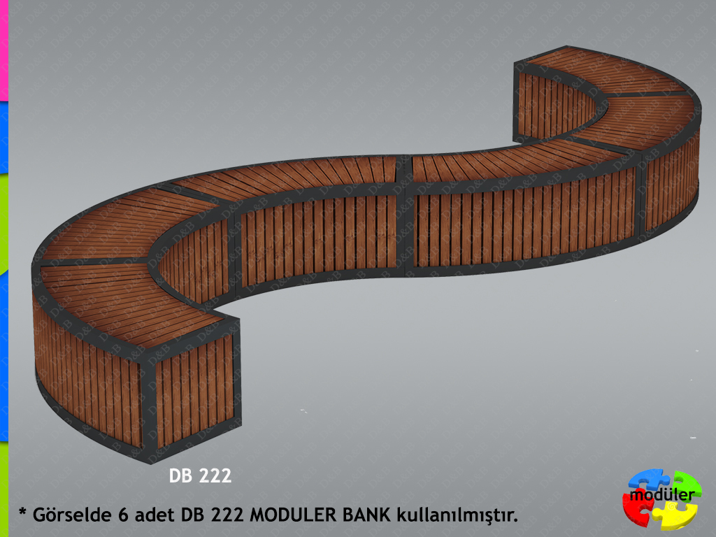 Kent mobilyaları üretiminde kalite ve tasarımı ön plana çıkararak, sektördeki rakiplerine öncülük eden DB Aydınlatma tarafından üretilen DB 222 modüler oturma bankı, galvanize edilmiş metal ve birinci sınıf emprenyeli ahşap kullanılarak üretilmiştir. Cadde, park, bahçe gibi dış mekanlarda kullanım için ideal olan ürün; hem kullanıcı deneyimi hem de dayanıklılığı ile tercih sebebi olmaktadır.
